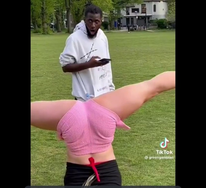 She was seen putting her hands on the ground and opening her legs very wide as you can see in the pictures below. The guy was astonished by the acrobatic moment of the lady that he opened his mouth very wide in shock. It appears he was not thinking that the lady can do such a thing.