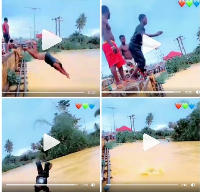 You can see pedestrians and cars passing on this bridge but these grown-up men and women have no shame at all. It was the lady who threw herself into the river first. She was seen wearing an outfit as if she was going to swim in a pool. The guys were seen throwing themselves into the river and having fun in this dirty river.