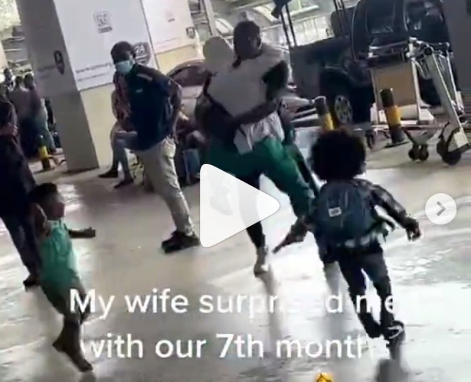 A woman probably between the ages of 25 and 35 years old has shown how she surprised her husband with their 7 months of pregnancy and many social media users after coming across this video couldn't keep mute over it. If you watch the video carefully, you can see that the woman went to wait for her husband at the airport with her daughter, who might probably be between the ages of 3 and 6 years old.
